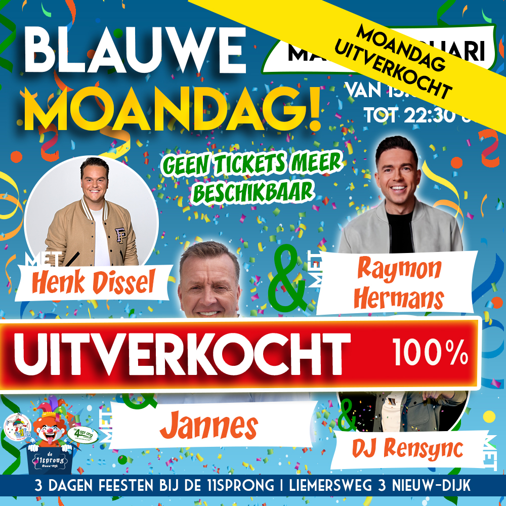 De laatste kans om nog even te knallen en een gezellig carnaval te vieren bij residentie De 11sprong met onze DJ Roel Staarink, onze artiesten; Jeffrey Parmentier en Marvin de Geest. En natuurlijk de prijsuitreiking van de optocht (volwassen categorieën). Tickets hier beschikbaar: https://captainticket.nl/t/11jes/e/1121.